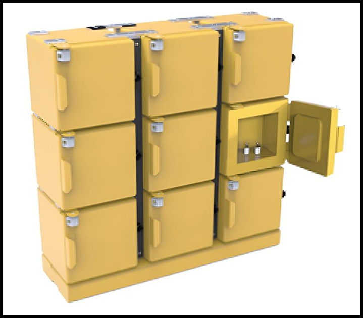 Se trata de cajas fuertes pequeñas y modulares, que permiten conectar múltiples de ellas para incrementar la capacidad de almacenamiento de fuentes radiactivas.